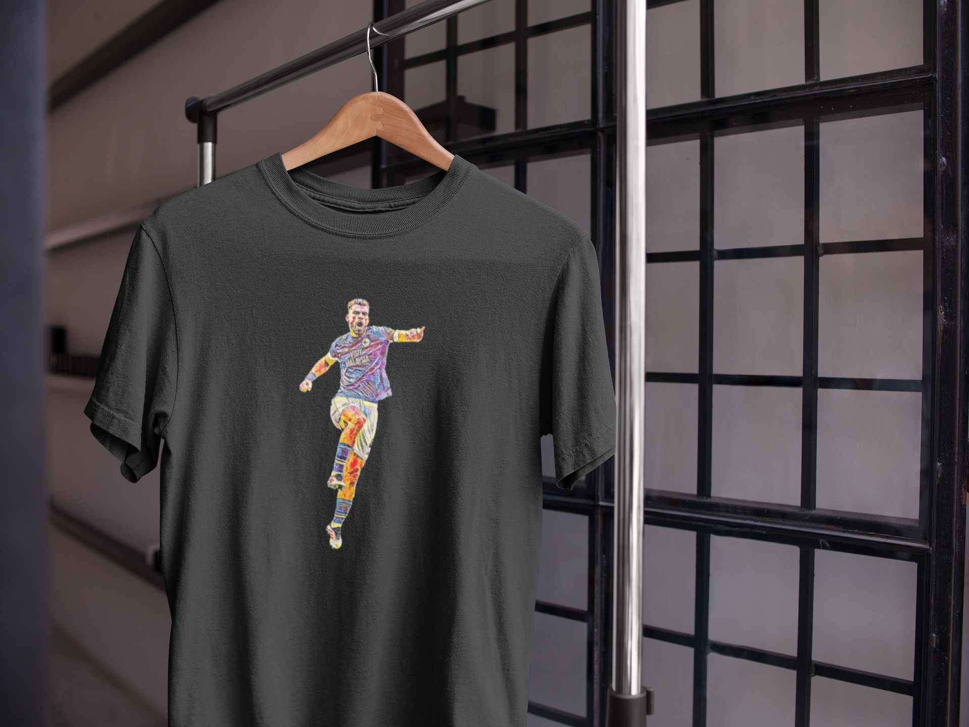 Cardiff City folklore player inspired design printed with high quality inks on a premium red t-shirt that is