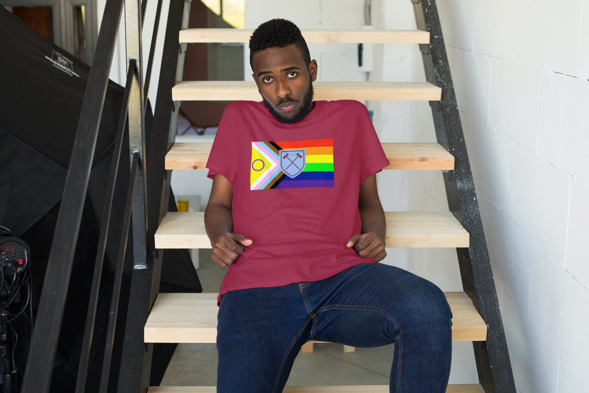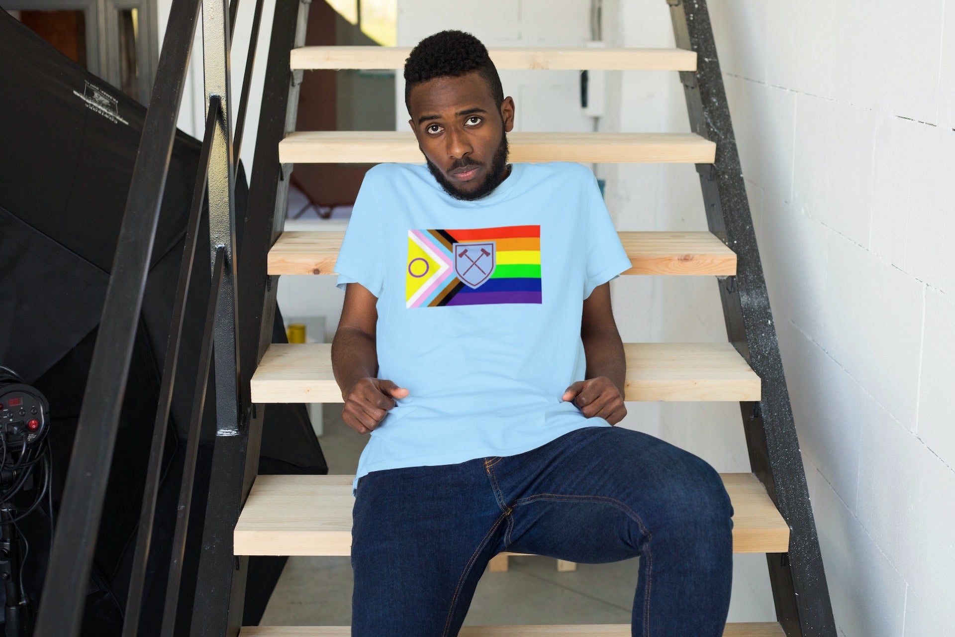 West Ham Pride/LBGTQ+ inspired design printed with high quality inks on a premium t-shirt that is
